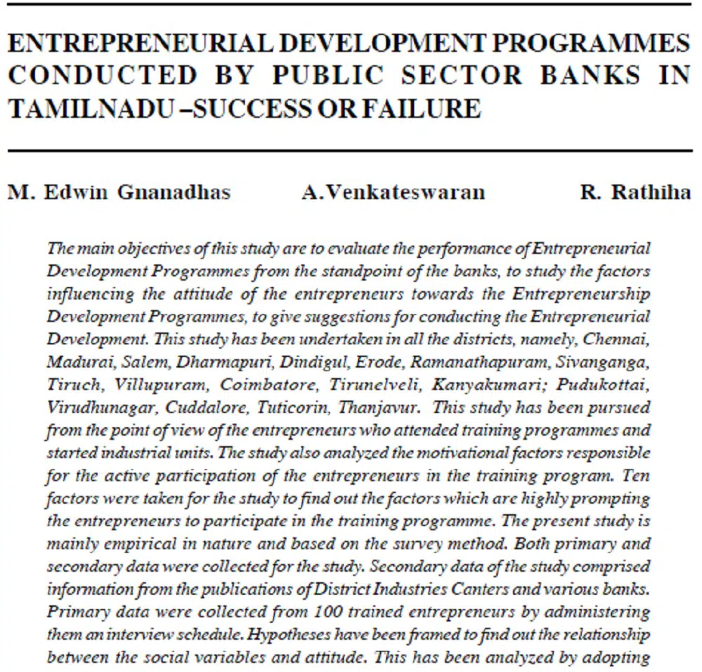 Entrepreneurial Development Programmes Conducted By Public Sector Banks In Tamilnadu – Success Or Failure | M. Edwin Gnanadhas, A.Venkateswaran & R. Rathiha
