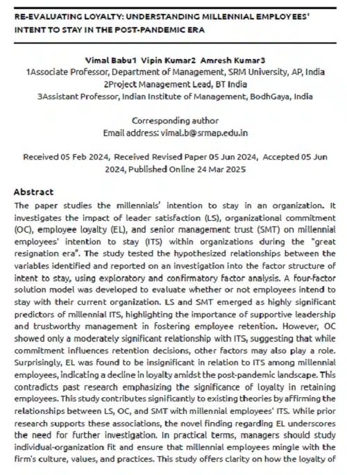 Re-Evaluating Loyalty: Understanding Millennial Employees’ Intent To Stay In The Post- Pandemic Era | Vimal Babu, Vipin Kumar & Amresh Kumar