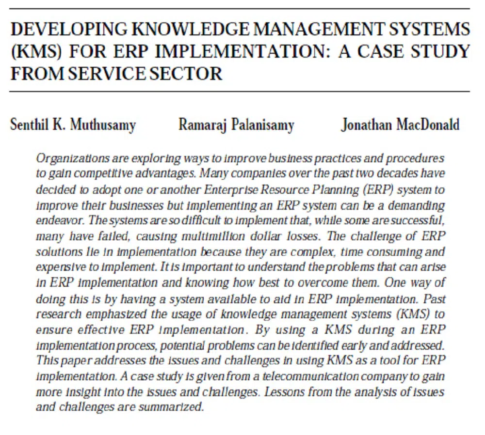 Developing Knowledge Management Systems (KMS) For Erp Implementation: A Case Study From Service Sector | Senthil K. Muthusamy, Ramaraj Palanisamy & Jonathan MacDonald